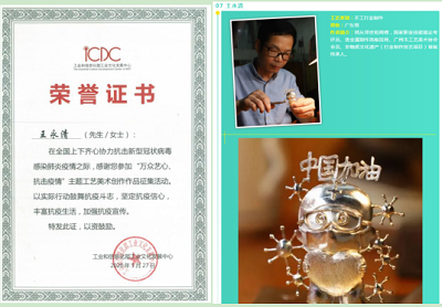 在全國(guó)上下齊心協(xié)力抗擊新冠疫情之際,穗聯(lián)公司打金制作技藝市級(jí)非遺傳承人王永清制作的《致敬抗疫英雄》足銀擺件參加了由國(guó)家工業(yè)和信息化工業(yè)文化發(fā)展中心舉辦的“萬(wàn)眾藝心、抗擊疫情”主題工藝美術(shù)創(chuàng)作作品征集活動(dòng),作品獲得了主辦方的采納,在國(guó)家工藝美術(shù)產(chǎn)業(yè)公共服務(wù)平臺(tái)“‘萬(wàn)眾藝心、抗擊疫情’主題工藝美術(shù)創(chuàng)作作品展(第十三期)”進(jìn)行了推廣和宣傳,并向王永清個(gè)人授予榮譽(yù)證書(shū),以資鼓勵(lì),高度贊揚(yáng)其以“藝”抗“疫”的優(yōu)秀精神。